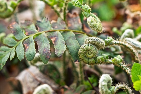 When the ground first begins to warm in March and April, ferns begin their growing season. Many open from a curled up state called a fiddlehead. Fiddleheads of certain ferns are eaten (gently sauteed in butter) and considered delicious by many. My brother and his family grow ferns and eat the fiddleheads in early spring, although they say, eh - rather tasteless. I guess, like all things in life, it's a matter of personal taste:>). Some ferns begin life quite pale in color and deepen their green as they mature. Some have different colors for new growth (there is a reddish brown example below) that is rapidly overtaken by green as food is made and stored. Plants make their food through photosynthesis. The green chlorophyll in a plant takes sunlight and converts it to a sugar compound for food for the plant. To do this, plants absorb sunlight in the red and blue color ranges; they can't use light in the green range for their food-making so green is not absorbed into the plant. The green we see is actually the reflected light a plant cannot absorb. The reason there are different shades of green is because each plant uses differing amounts of reds and blues in their food factories making the reflected light slightly different.